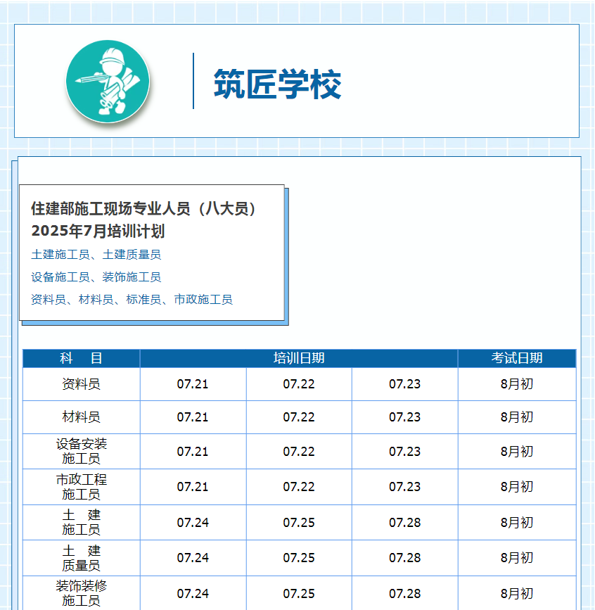 2025年7月施工现场专业人员(八大员)培训考核招生通知